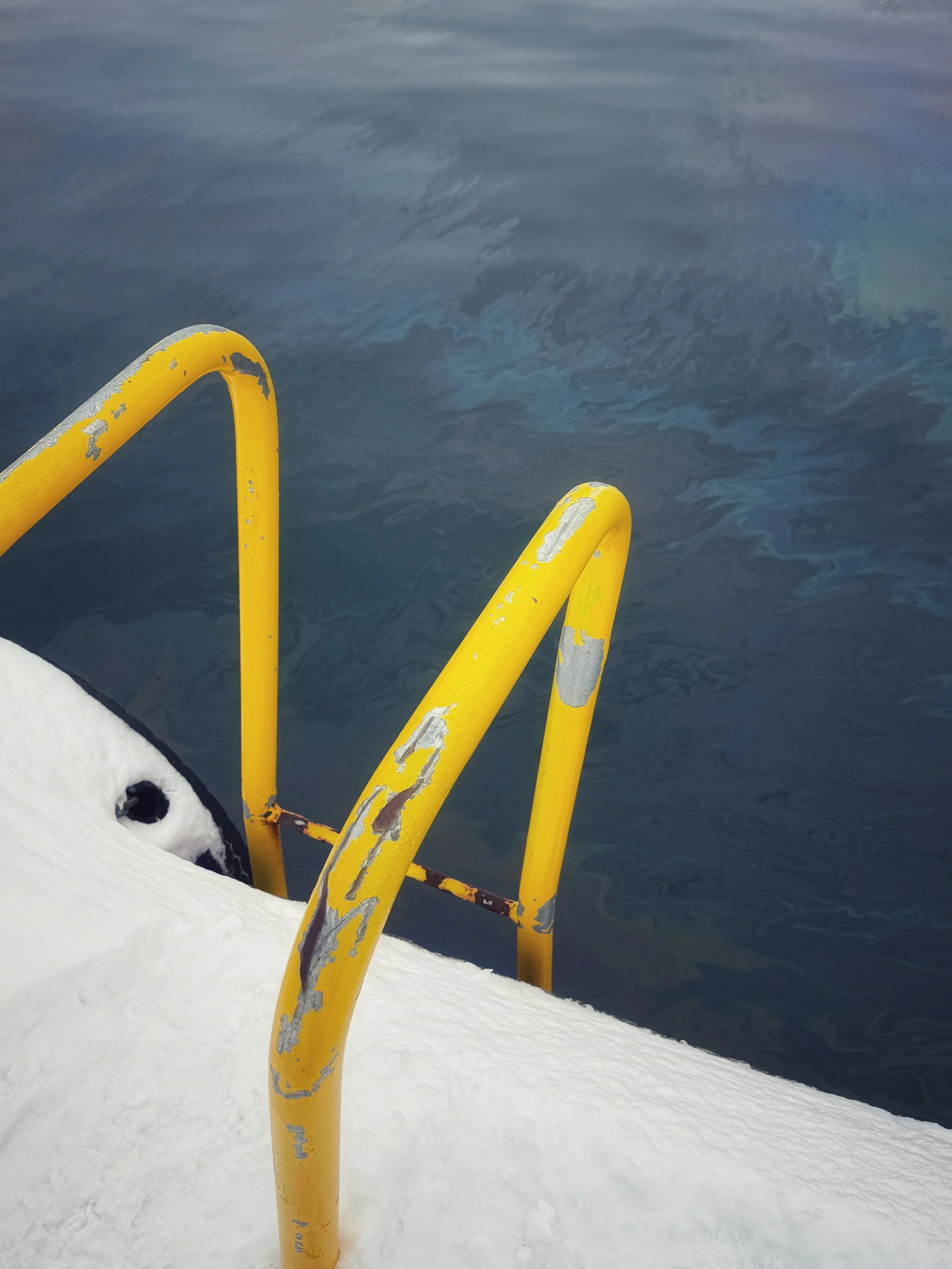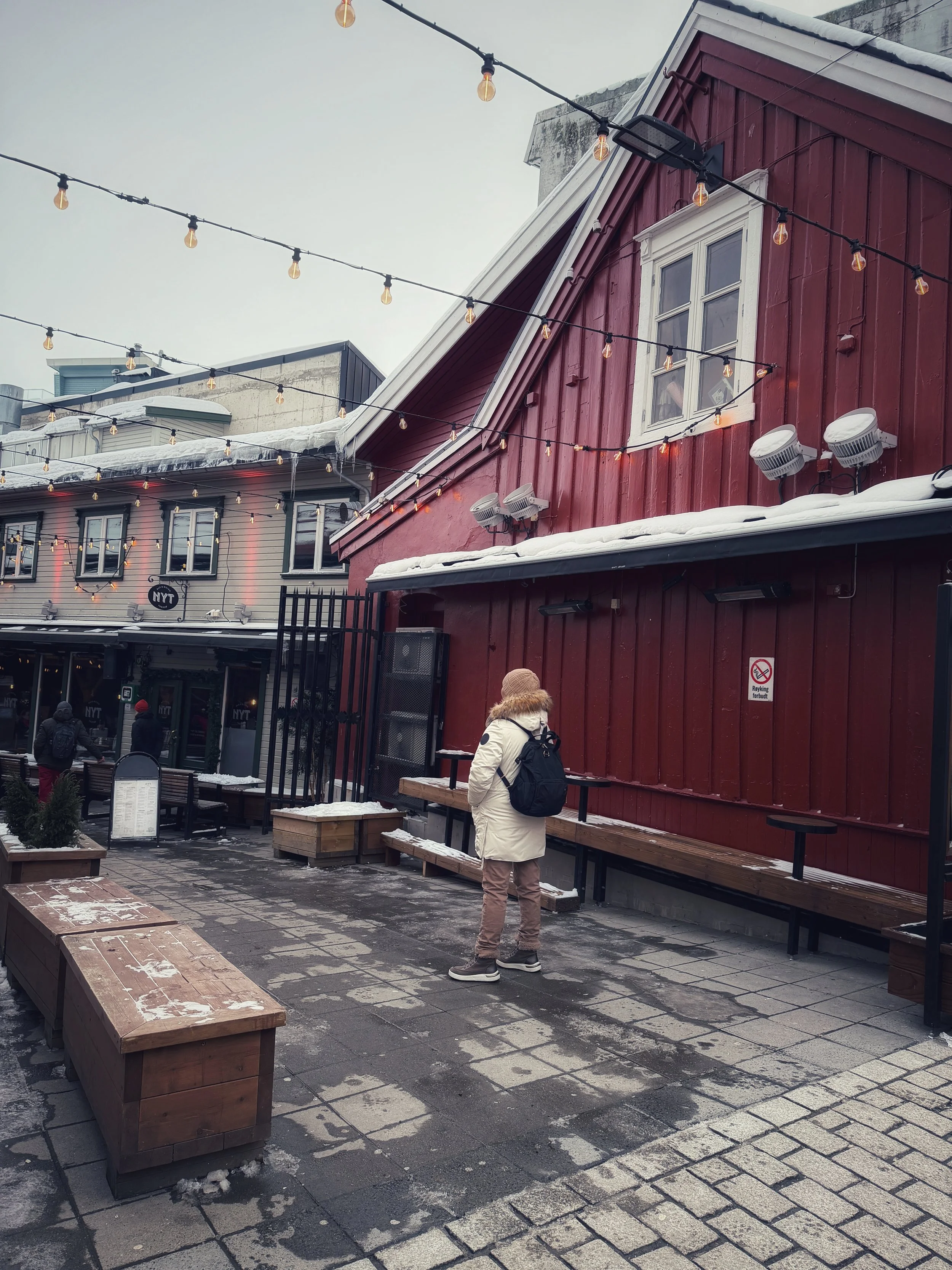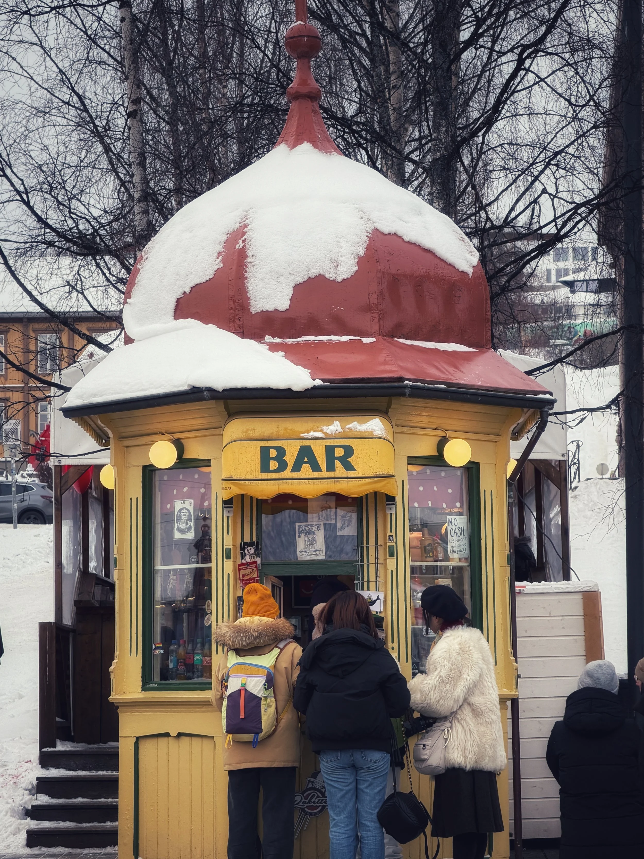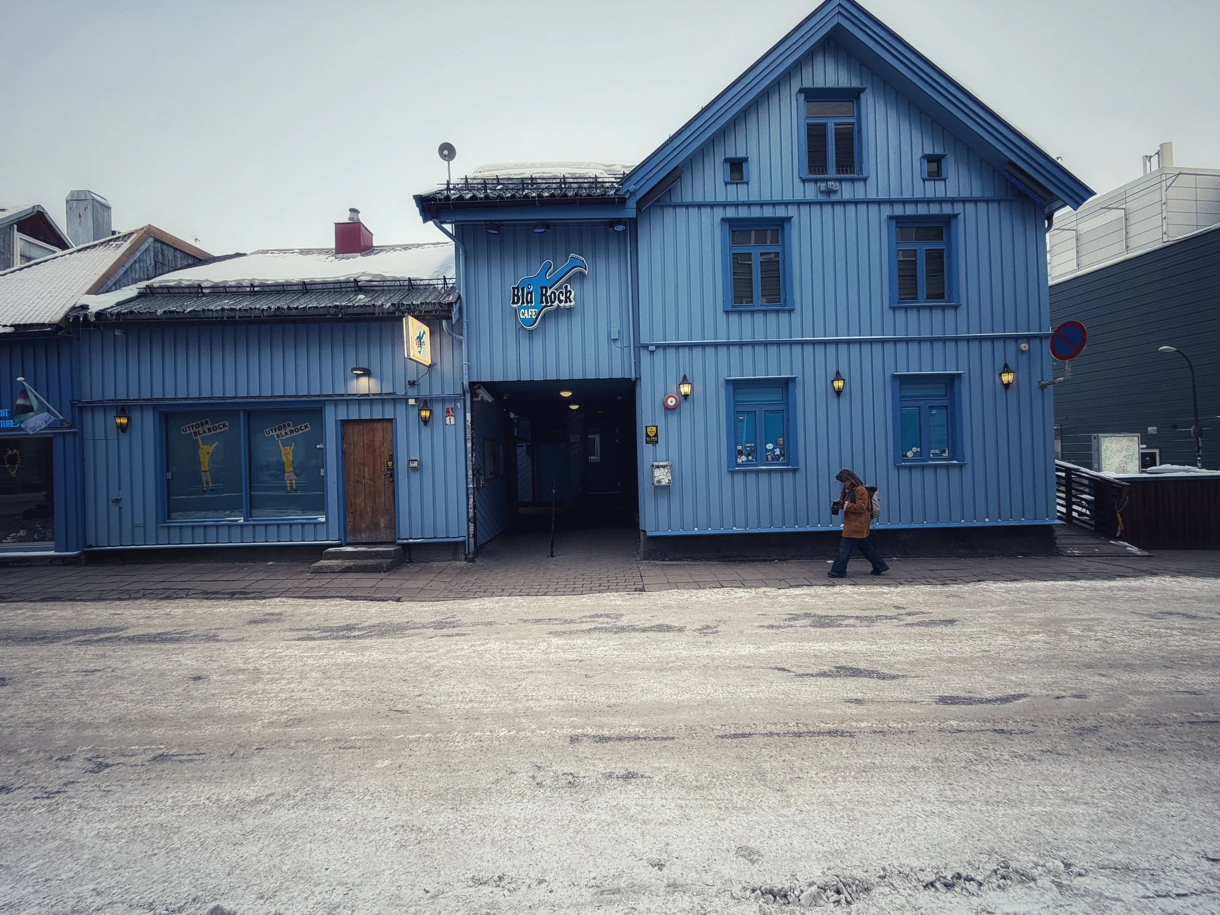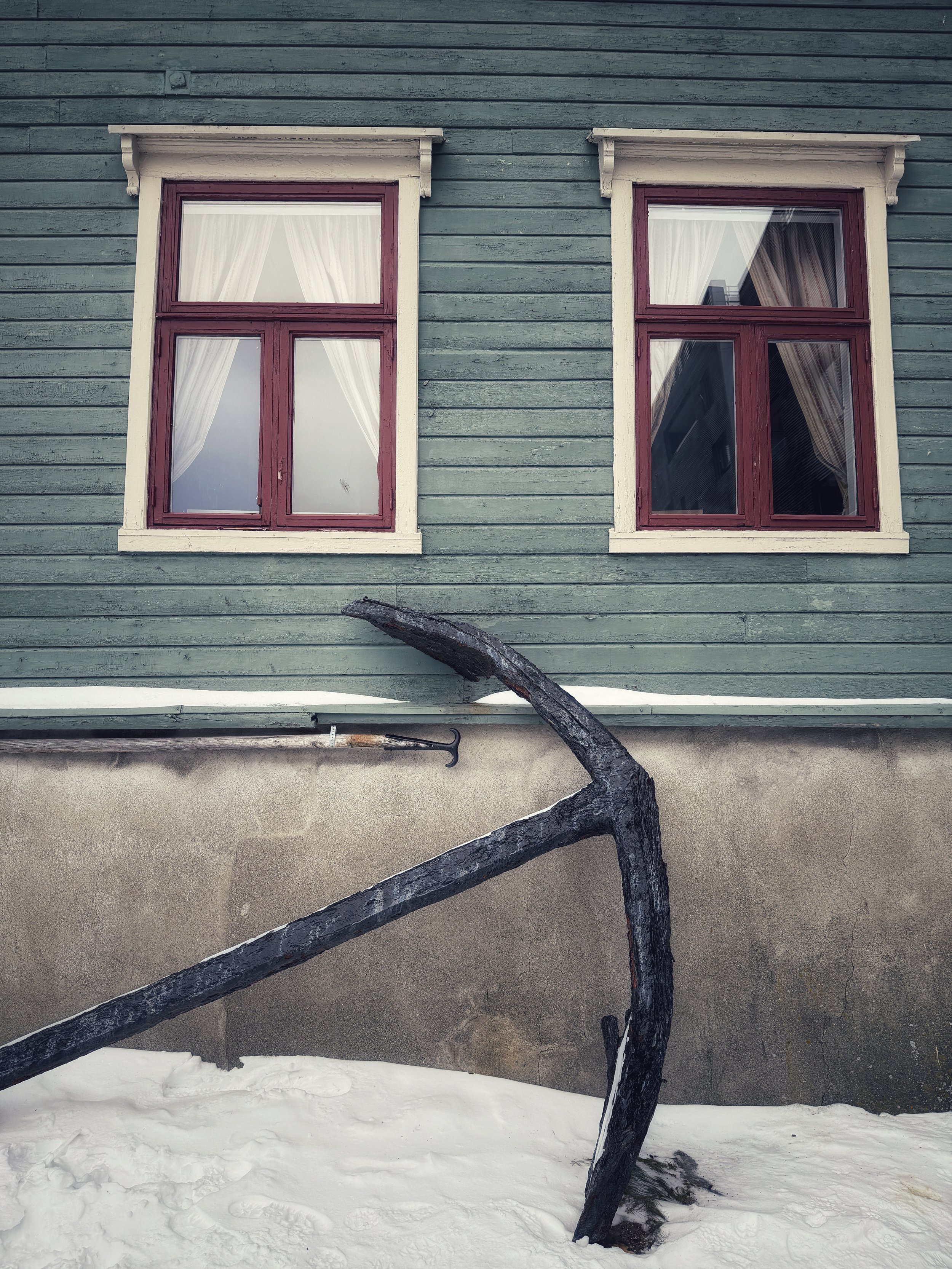 The city reveals itself slowly. Painted houses in muted blues and reds stand close together against the cold, their colors softened by snow and pale light. Small details emerge first: a bar kiosk glowing faintly in the afternoon, an anchor resting beneath a window, a ladder descending into dark Arctic water.