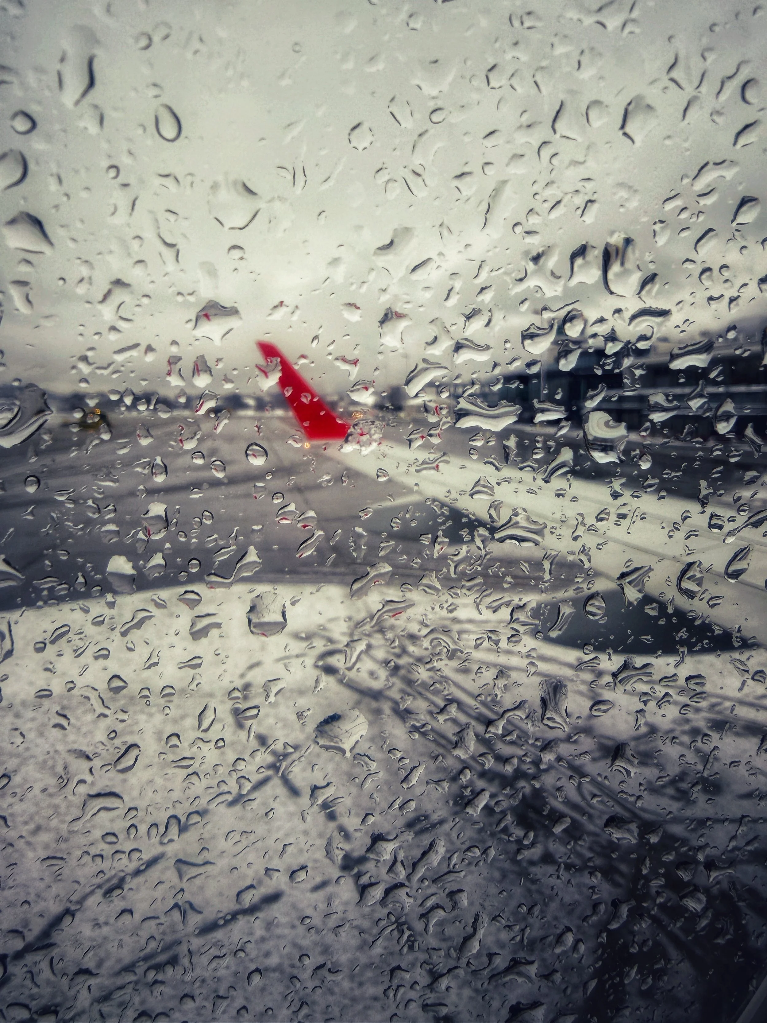 On the runway in Innsbruck, the world beyond the airplane window dissolved into water and grey light. The mountains were there somewhere, but hidden — as if the landscape had already begun withdrawing into the distance.