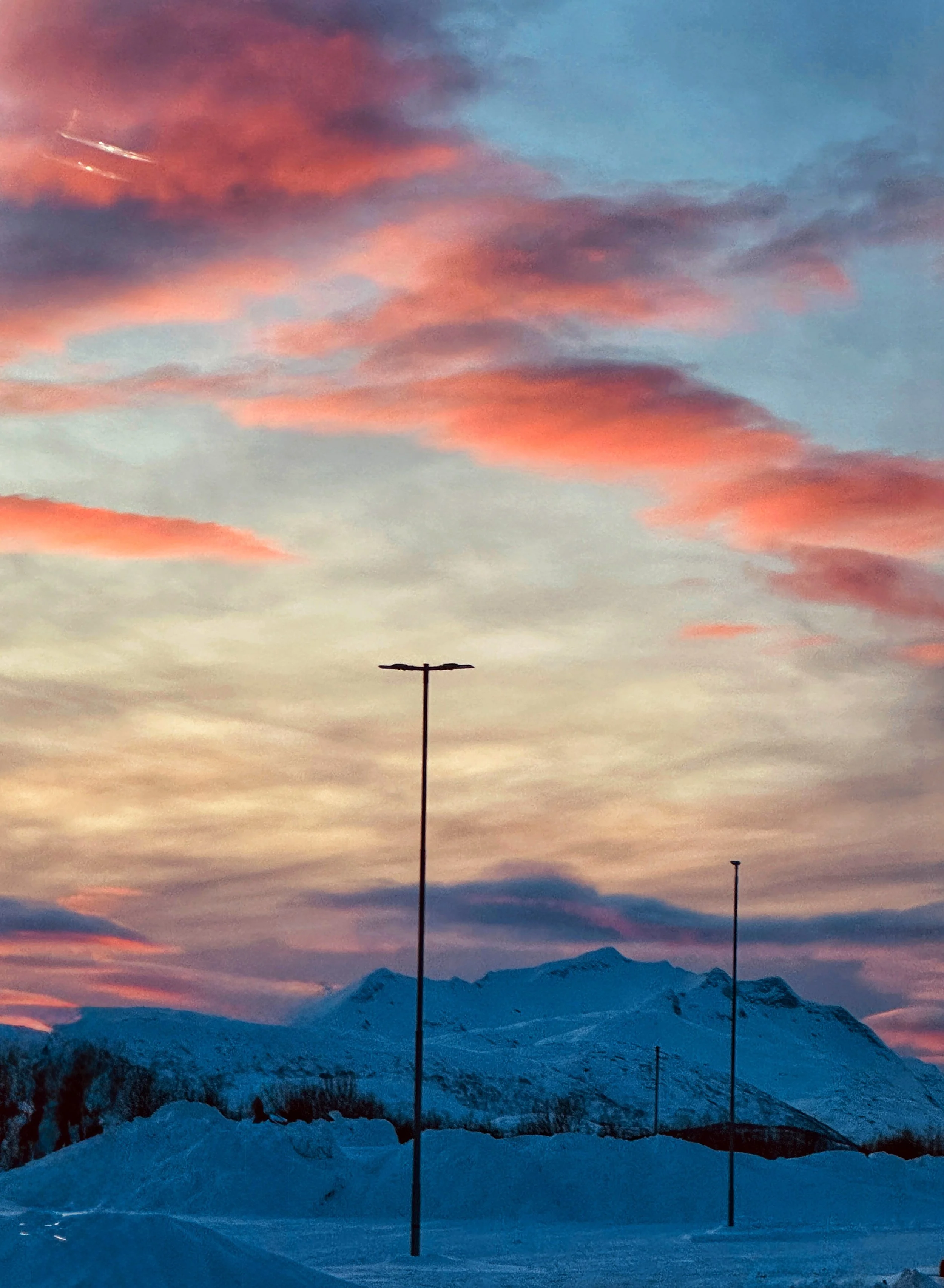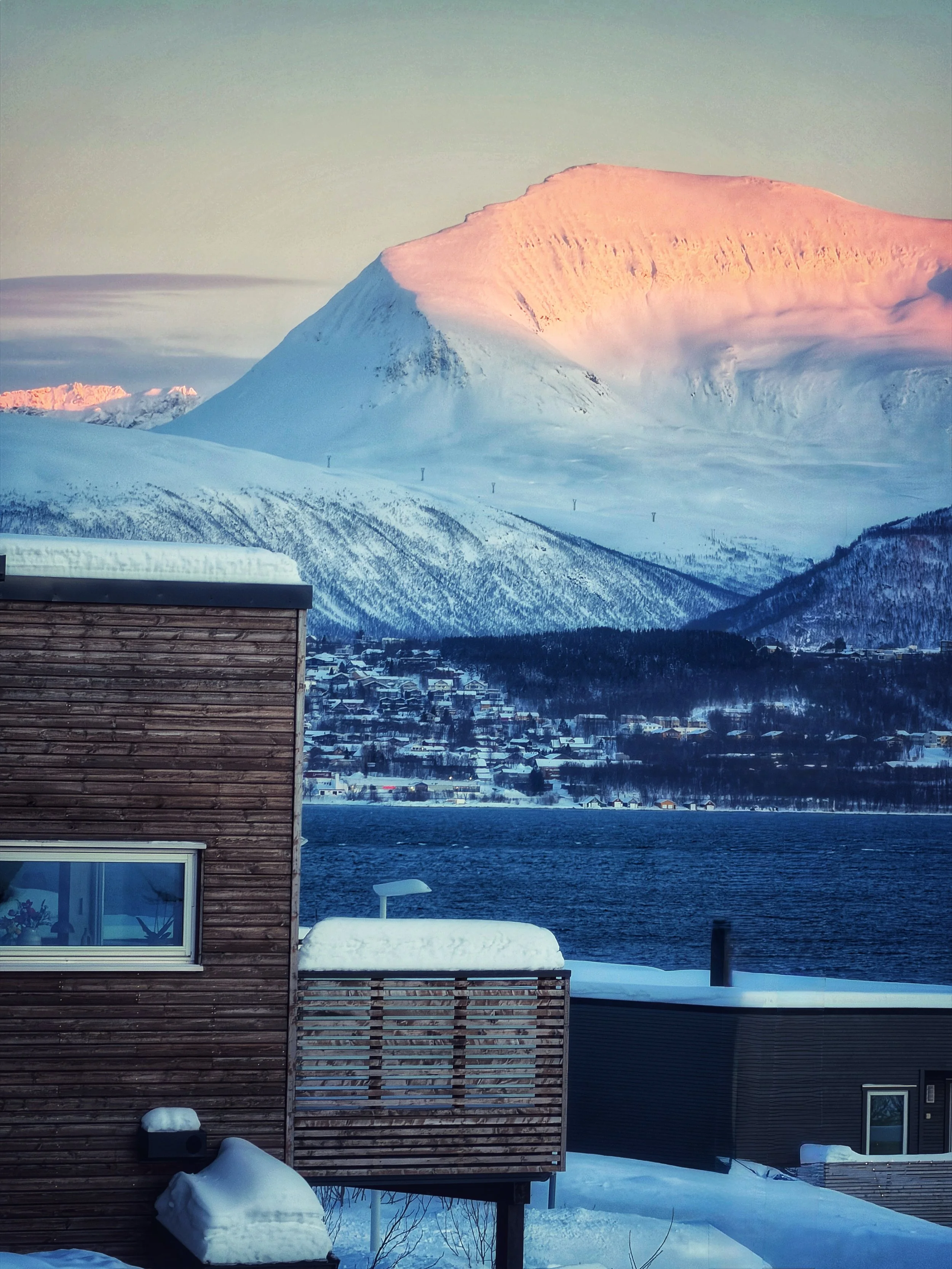Not suddenly, but gently — first as silhouettes, then touched by a pale pink light high above the fjord. It felt as if the day had begun somewhere far above the town and only later reached the streets below.