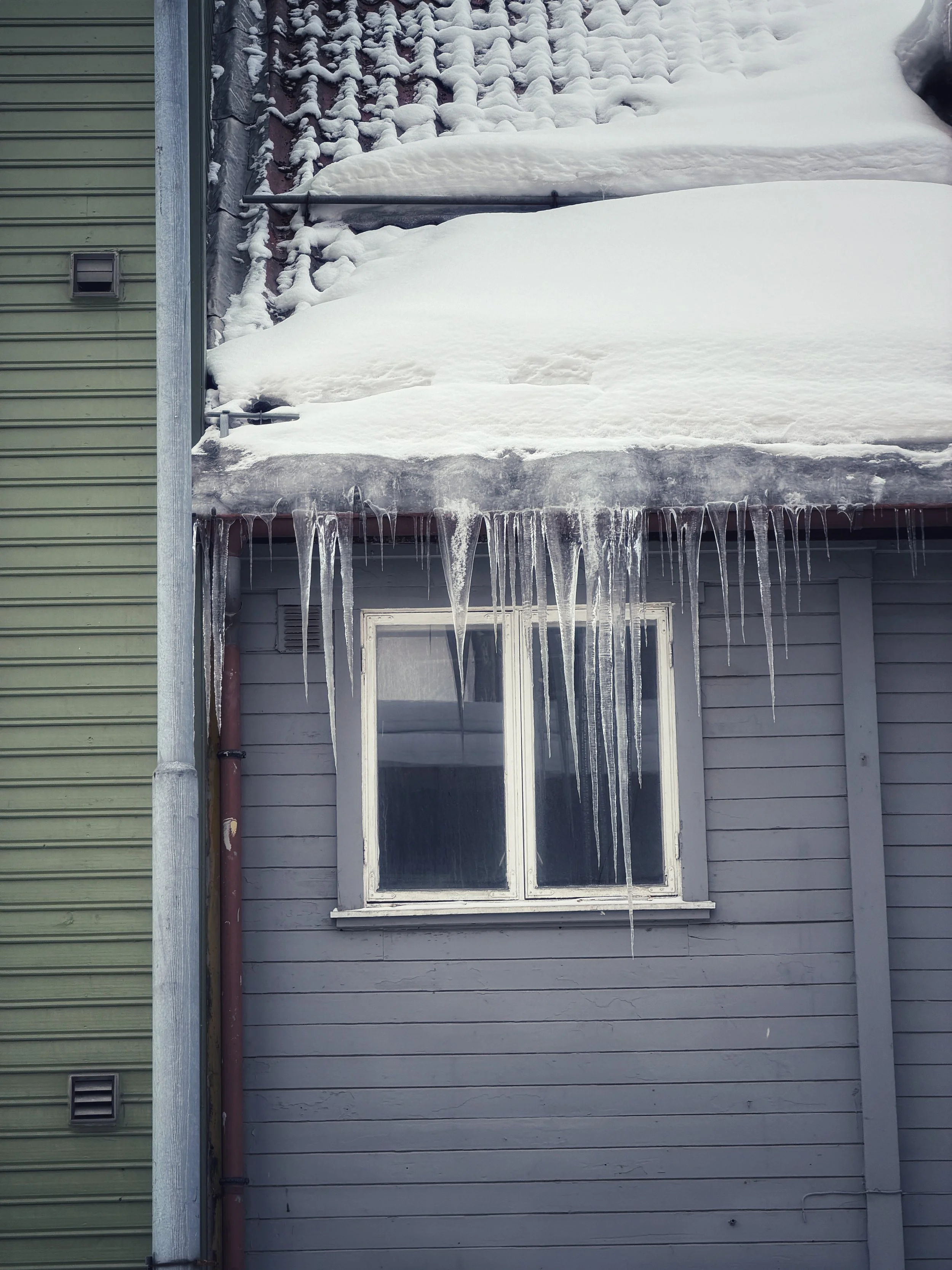 It settles into the grain of the wood, gathers along the roofs, and hangs quietly from the eaves in long, fragile lines of ice.