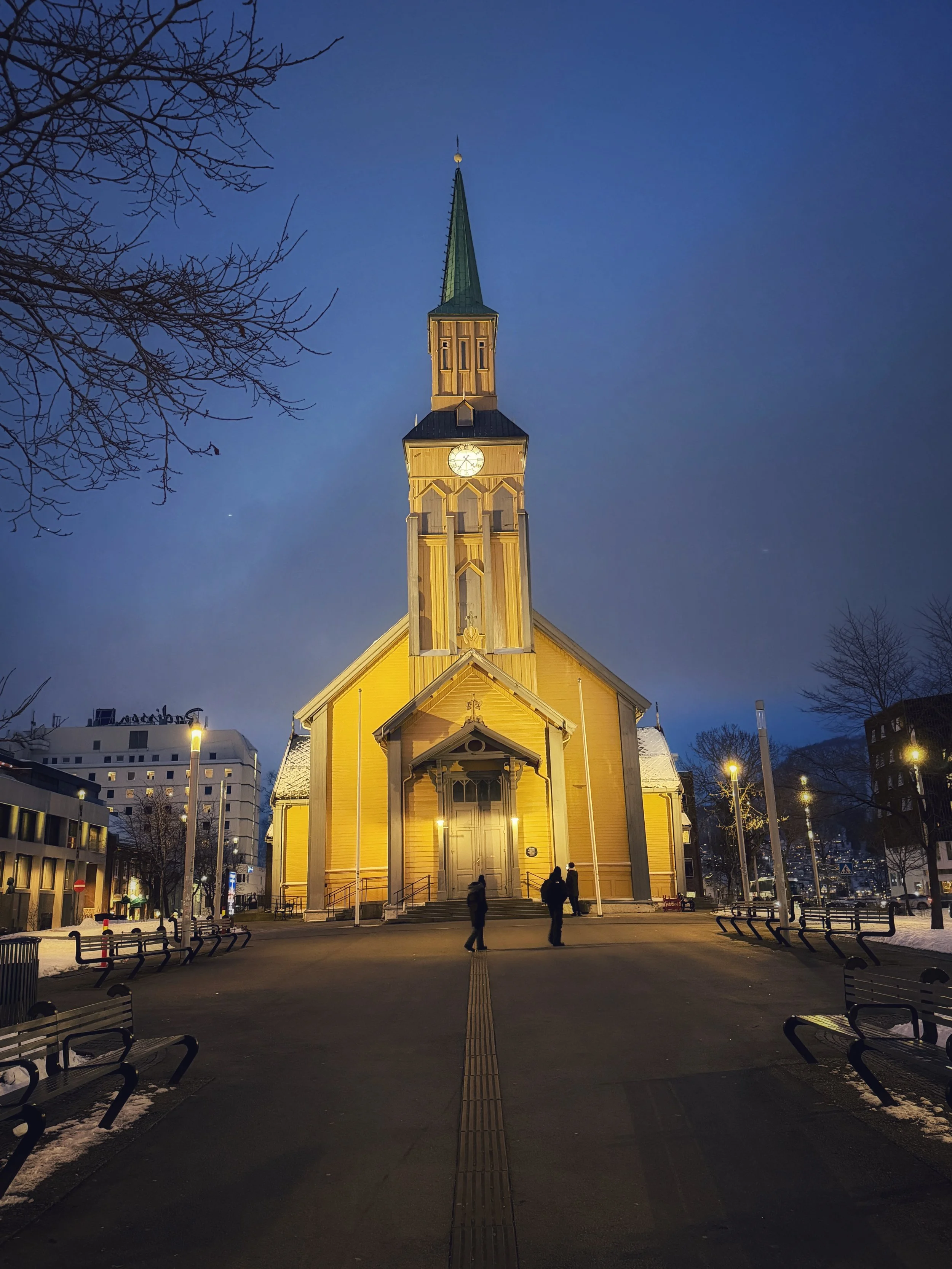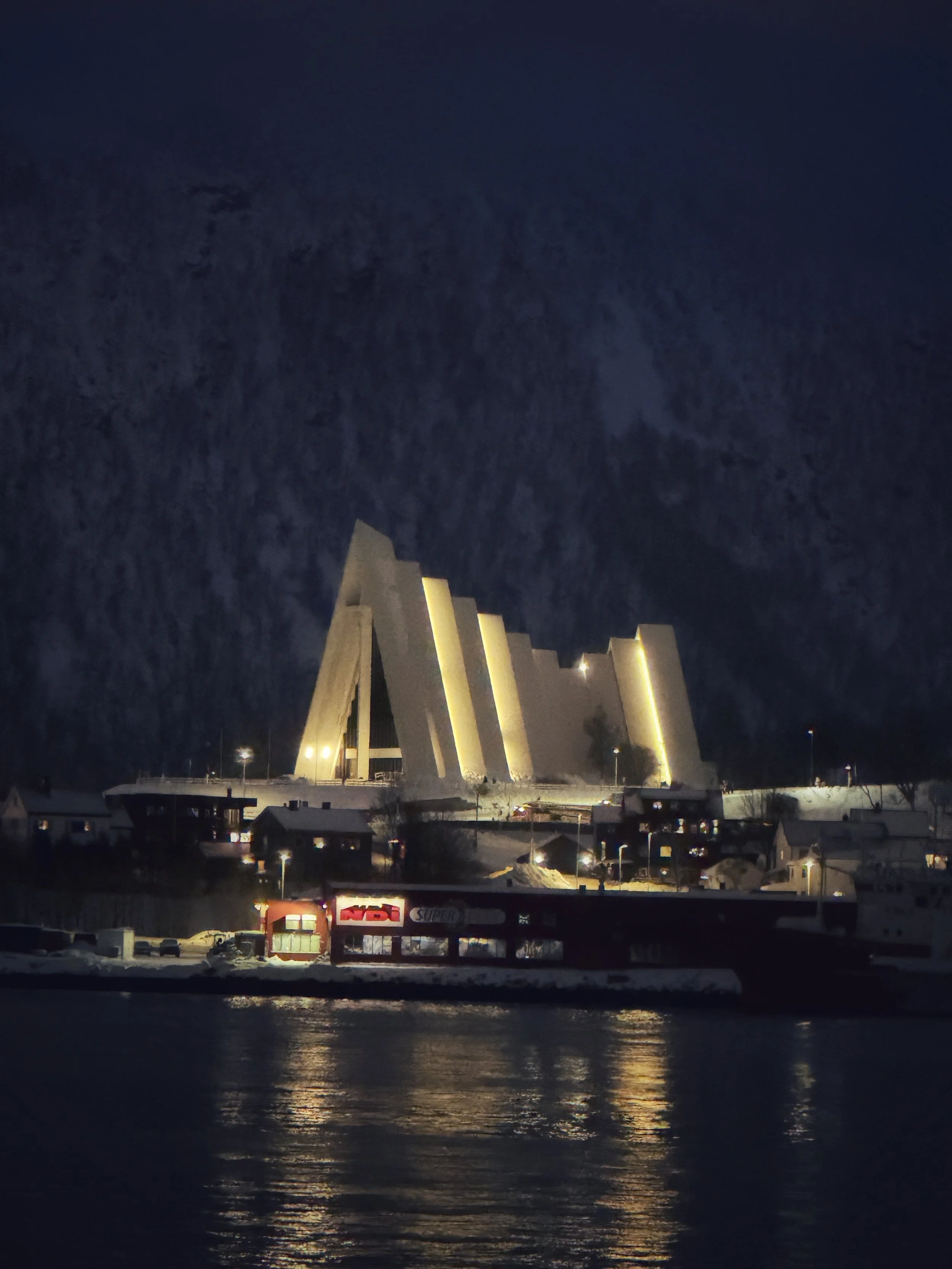 Streetlights glow softly on empty sidewalks. The wooden cathedral stands still in the cold air, its tower rising into a sky that never becomes completely dark. Across the water, the sharp white lines of the Arctic Cathedral shine against the mountains.
