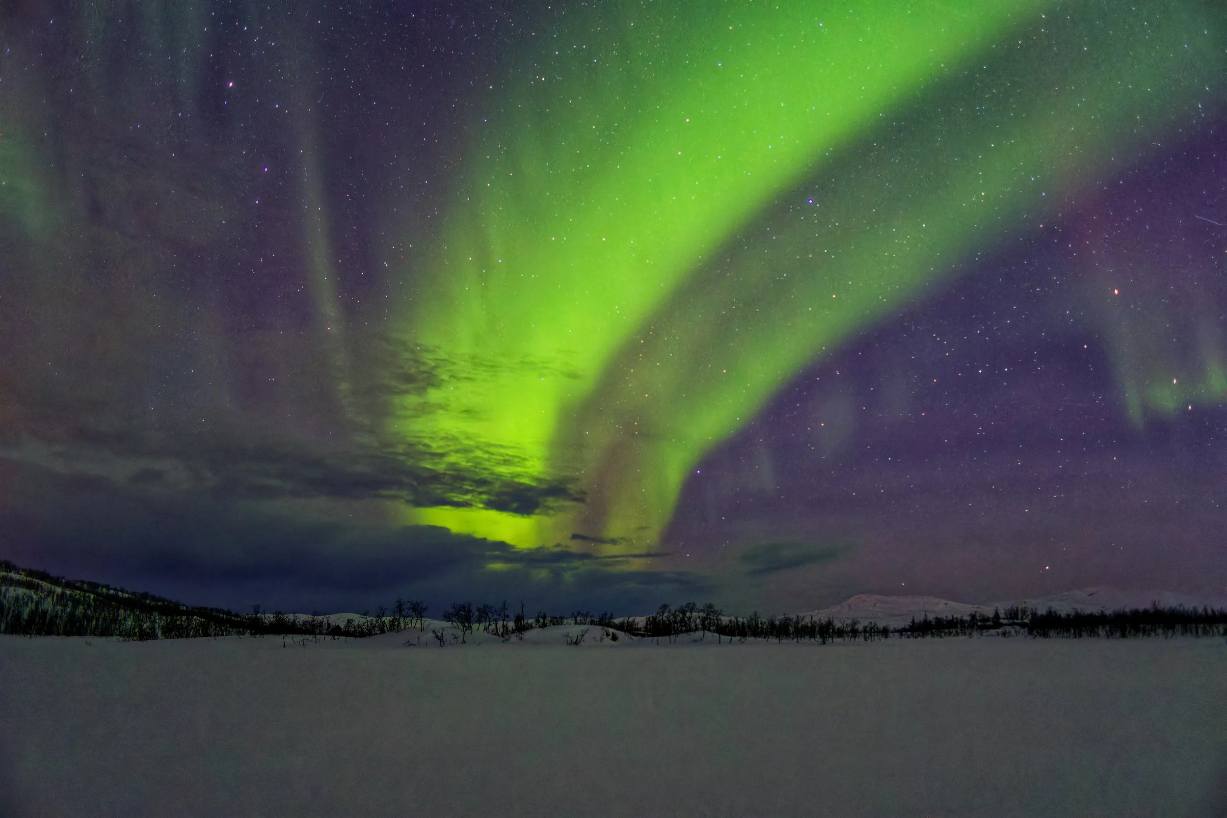 A faint ribbon appears above the horizon. It grows brighter, stretching across the night like a curtain caught in a silent wind. Green light spreads over the mountains and across the frozen ground, shifting and folding in slow, impossible shapes.