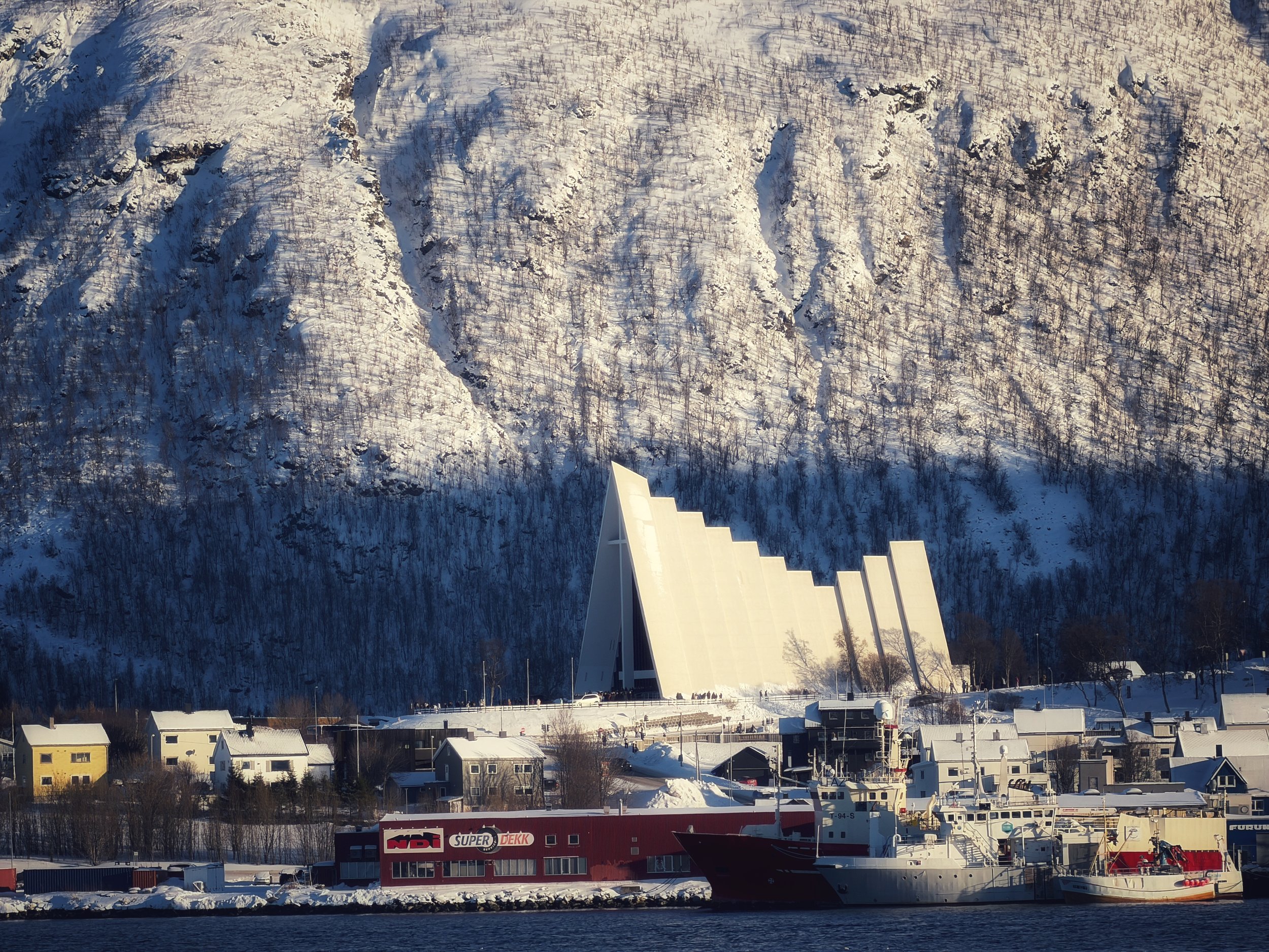 And above it all, the white geometry of the Arctic Cathedral rises against the slope of the mountains, catching the low northern light like a sail turned toward the horizon.